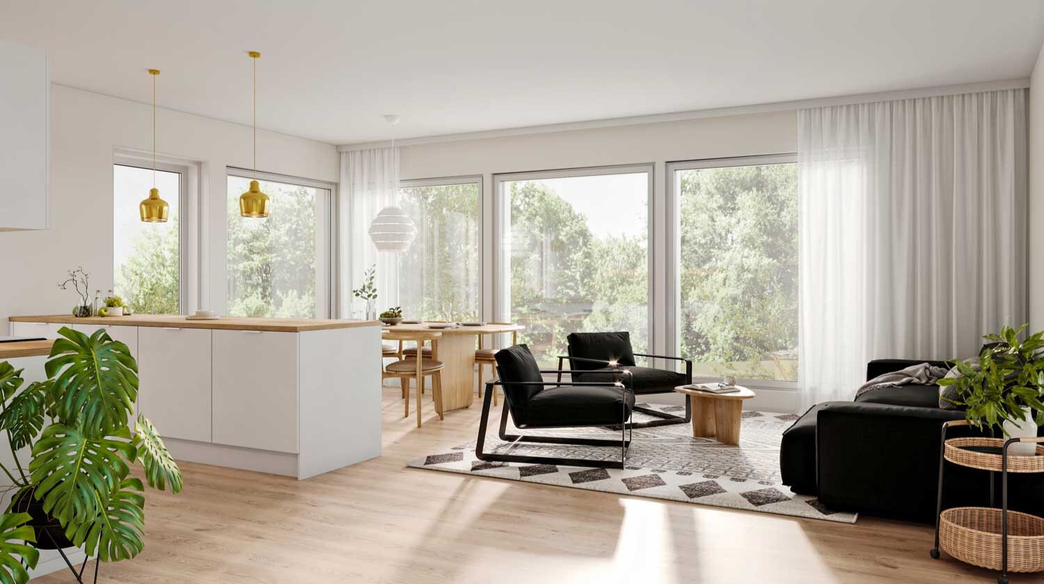 Kohde tarjoaa poikkeuksellista tilan tuntua, kun osassa asunnoista huonekorkeus nousee jopa 4,7 metriin ja suurista ikkunoista tulvii luonnonvalo sisään lähes lattiaan saakka. Rakennuksen ensimmäiseen kerrokseen sijoittuu pysäköintihalli sähköautojen latauspisteineen ja hissi joka kuljettaa suoraan asuntoihin.